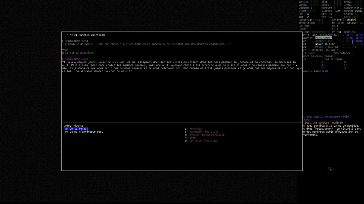 Ce qui distingue CDDA de la plupart des jeux de survie, c’est sa simulation poussée à l’extrême. Chaque objet du monde est interactif, chaque action a des conséquences. La gestion de la faim, de la soif, de la fatigue, de la température ou encore de l’état psychologique du personnage sont autant de paramètres à surveiller en permanence. Le système de craft permet de fabriquer des centaines d’objets différents, les véhicules sont entièrement modulaires, et le personnage peut évoluer via des mutations biologiques ou des implants cybernétiques.